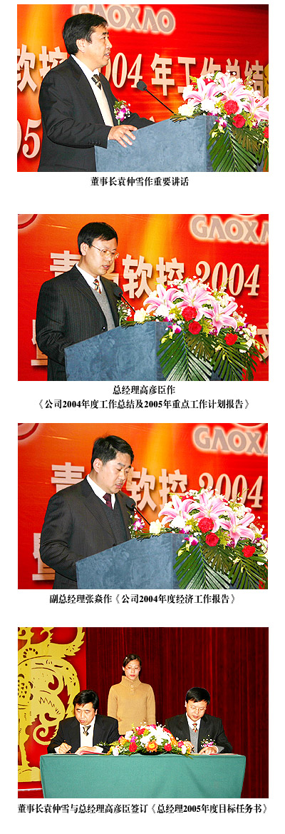 大會由副總經(jīng)理王金健主持。副總經(jīng)理張焱和總經(jīng)理高彥臣分別作了《公司2004年度經(jīng)濟工作報告》、《公司2004年度工作總結及2005年工作計劃報告》。會上公司各級領導分別一級對一級簽訂了《2005年目標計劃任務書》。最后董事長袁仲雪作重要講話。